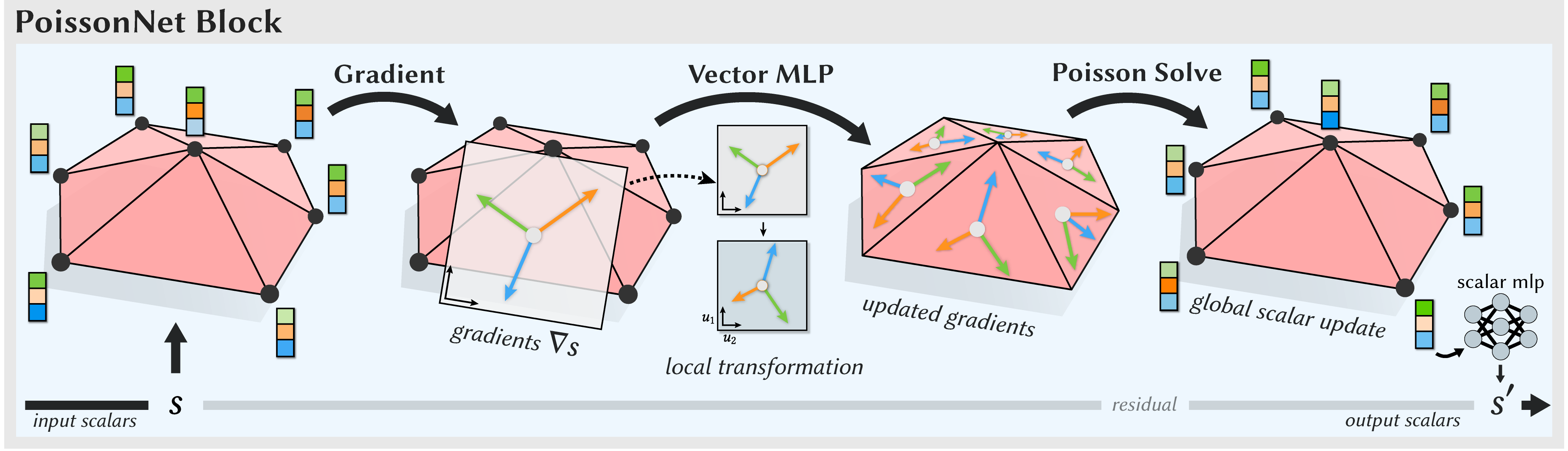 We illustrate our PoissonNet block on a surface patch of a triangle mesh. Our block begins by computing spatial gradients of the incoming scalar features—for demonstrative purposes, we depict the signal as having three channels (shown as green, orange, and blue), with color indicating signal intensity. The gradient features are transformed locally in each tangent basis (denoted by basis vectors u1 and u2) via a Vector MLP, which induces a linear combination of rotated and scaled gradients on each face. We then solve a global Poisson system using the transformed vector fields, producing new scalar features on vertices that are updated locally using a scalar (per-vertex) MLP. This process is repeated for N blocks, thereby producing a final feature representation on the shape. |