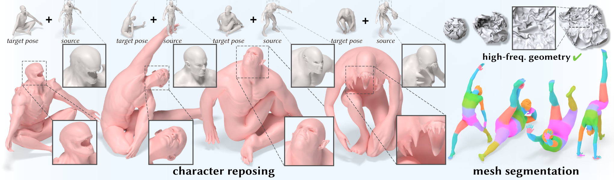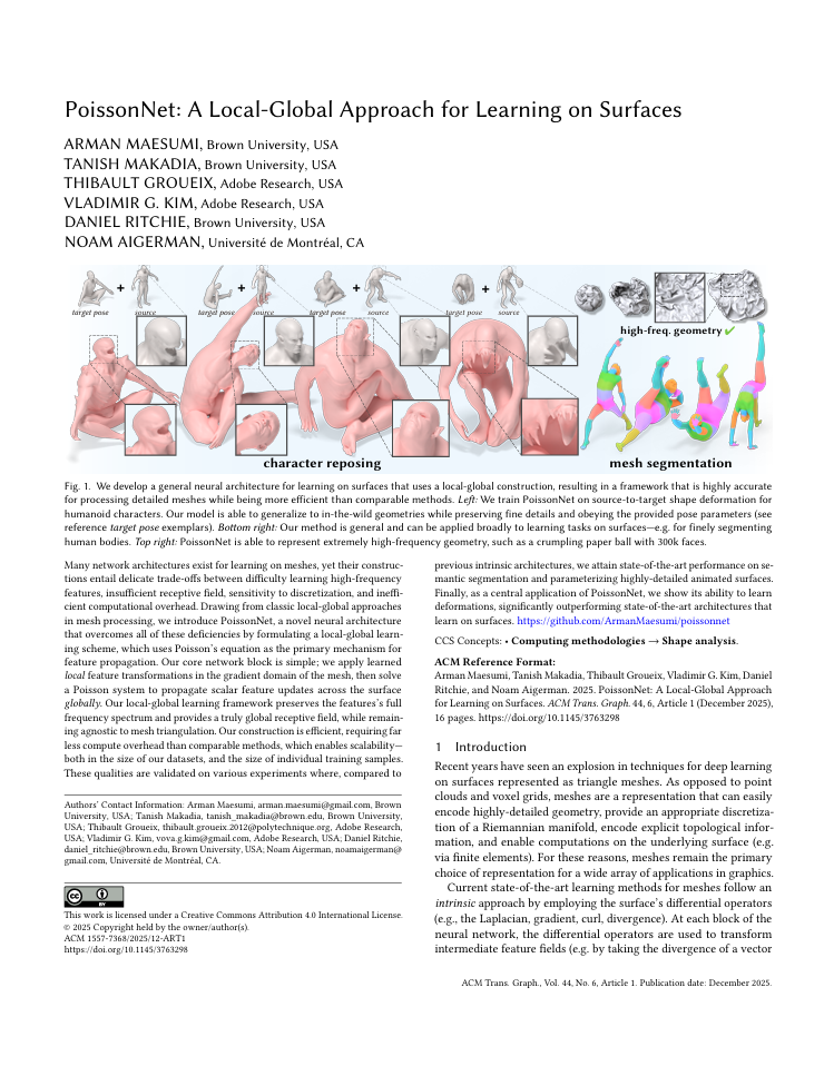 A. Maesumi, T. Makadia, T. Groueix, V. Kim, D. Ritchie, and N. Aigerman PoissonNet: A Local-Global Approach for Learning on Surfaces. In ACM Transactions on Graphics (Proceedings of SIGGRAPH Asia 2025). (hosted on arXiv) |